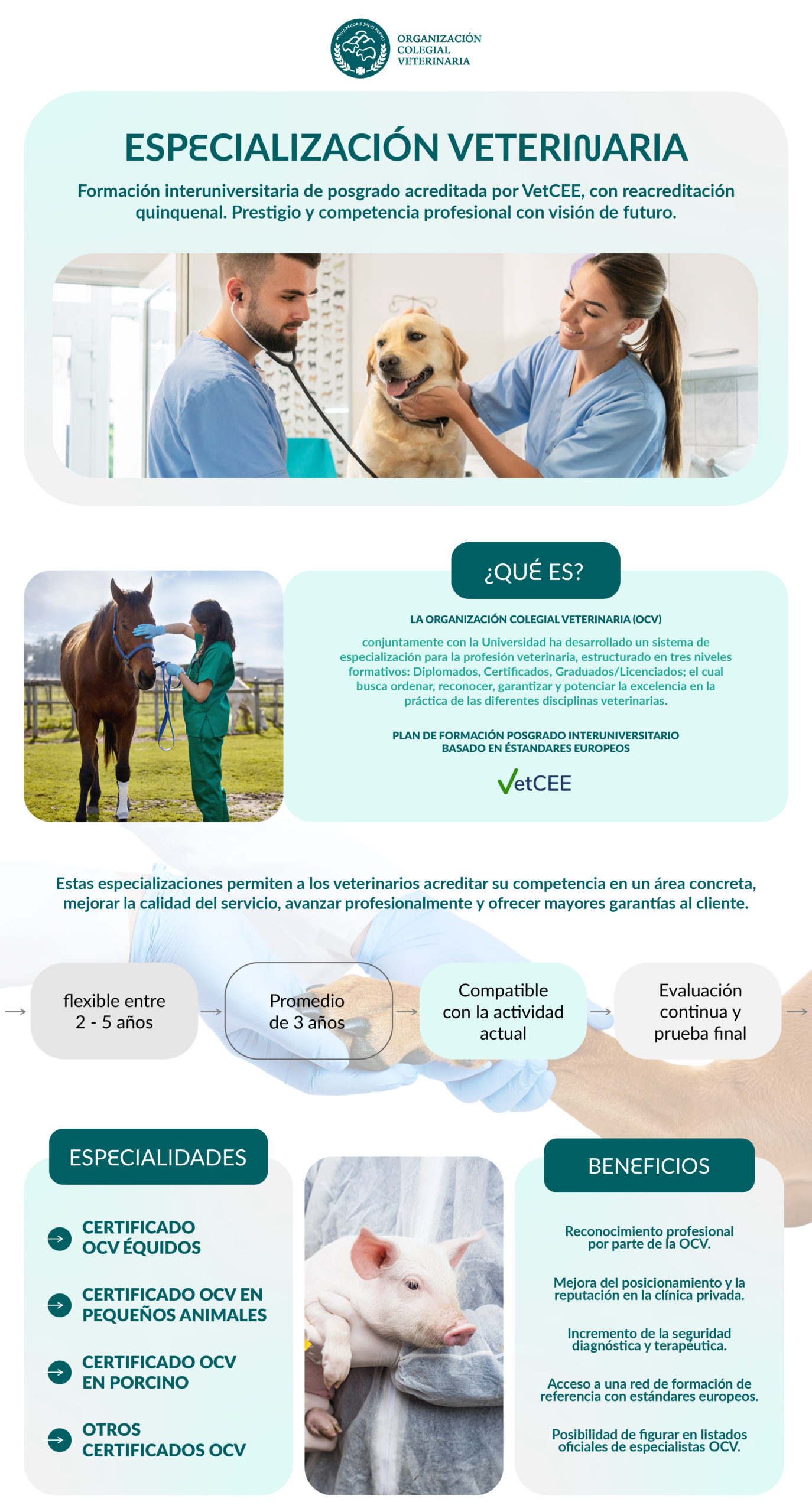 Durante esta sesión se presentará el sistema de especialización profesional veterinaria impulsado por la OCV, desarrollado en colaboración con las universidades y alineado con los estándares europeos de calidad educativa (VetCEE).